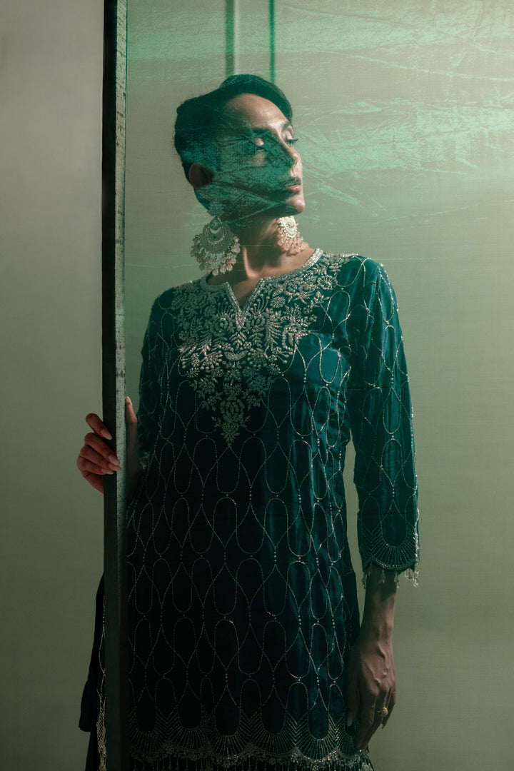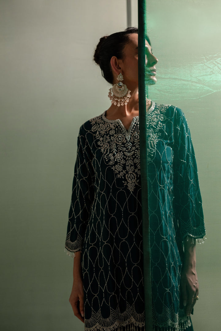 This black Sharara Kurti set features exquisite handcrafted Cutdana pearl and adi embroidery on soft Chinon fabric, offering a blend of traditional artistry and comfortable wear.