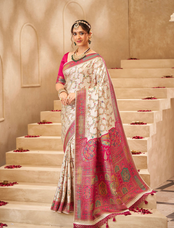 Saree Fabric: Traditional Dola Silk, Saree Colour: Cream (Multi), Blouse Fabric: Satin Silk, Blouse Colour: Pink, Blouse Piece Length: 1.2 meter (Stitch Blouse: 40 Size (L)), Saree Length: 5.4 meter