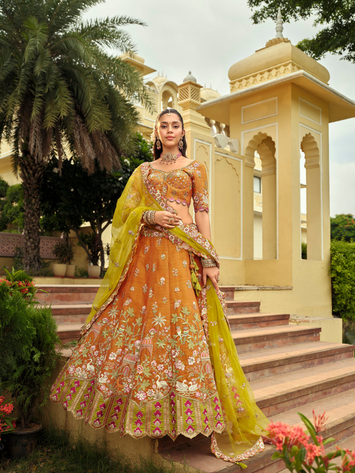 Lehenga Fabric: Fancy Silk (Customise upto 42"), Lehenga Colour: Rust, Lehenga Type: Circular, Lehenga Gher: 4 meters, Blouse Fabric: Silk, Blouse Colour: Rust, Blouse Piece: Stitch, Dupatta: Net With Heavy Work, Dupatta Colour: Liril, Dupatta Length : 2.5 meters