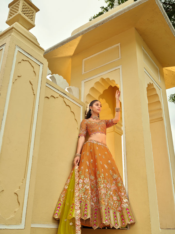Crafted from premium rust silk, this designer lehenga showcases exquisite craftsmanship and a rich texture that enhances its elegant appeal. Paired with a matching Liril dupatta and a stitched blouse, this ensemble offers a seamless blend of tradition and contemporary style, ideal for festive occasions and celebrations. The breathable silk fabric ensures comfort while maintaining a luxurious look, making it a refined choice for discerning wardrobes.