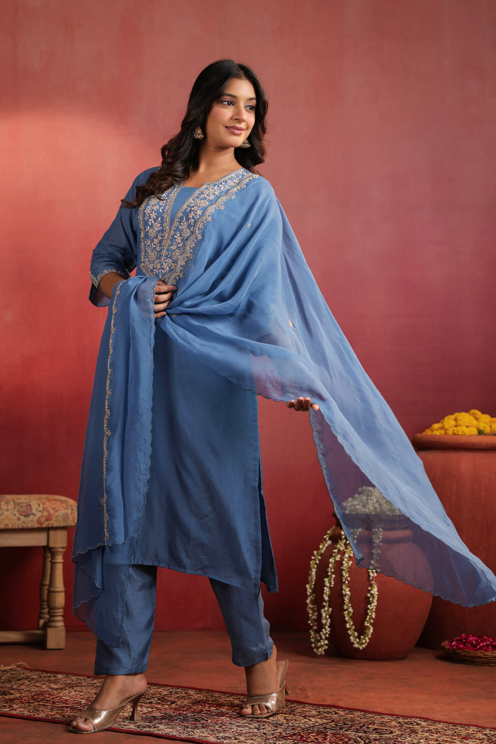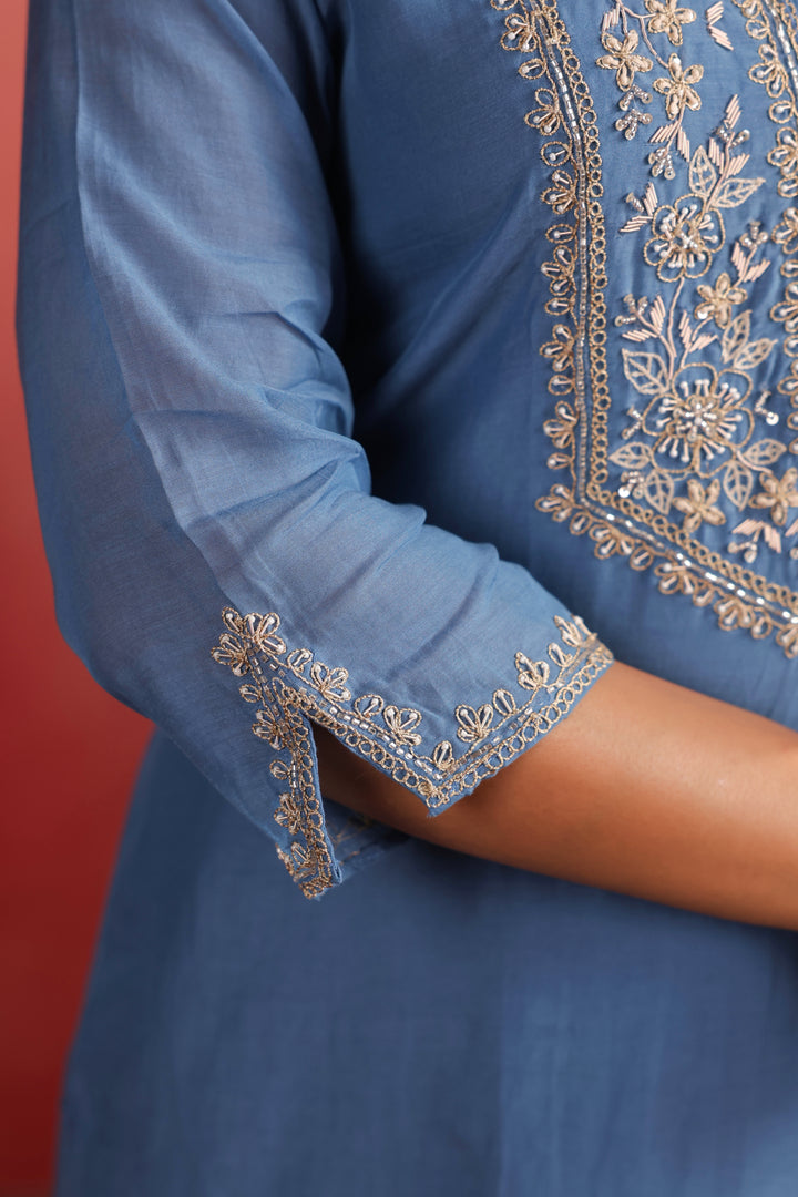 This Mul Blue Kurti Pant Set showcases exquisite craftsmanship with intricate hand embroidery featuring thread, pearl, zardozi, marodi, and cutdana work. Made from pure Mul Chanderi fabric, it offers a lightweight and breathable feel, perfect for elegant occasions. The harmonious blend of detailed embellishments elevates the traditional design, ensuring a sophisticated and timeless ensemble that combines comfort with artistic finesse.