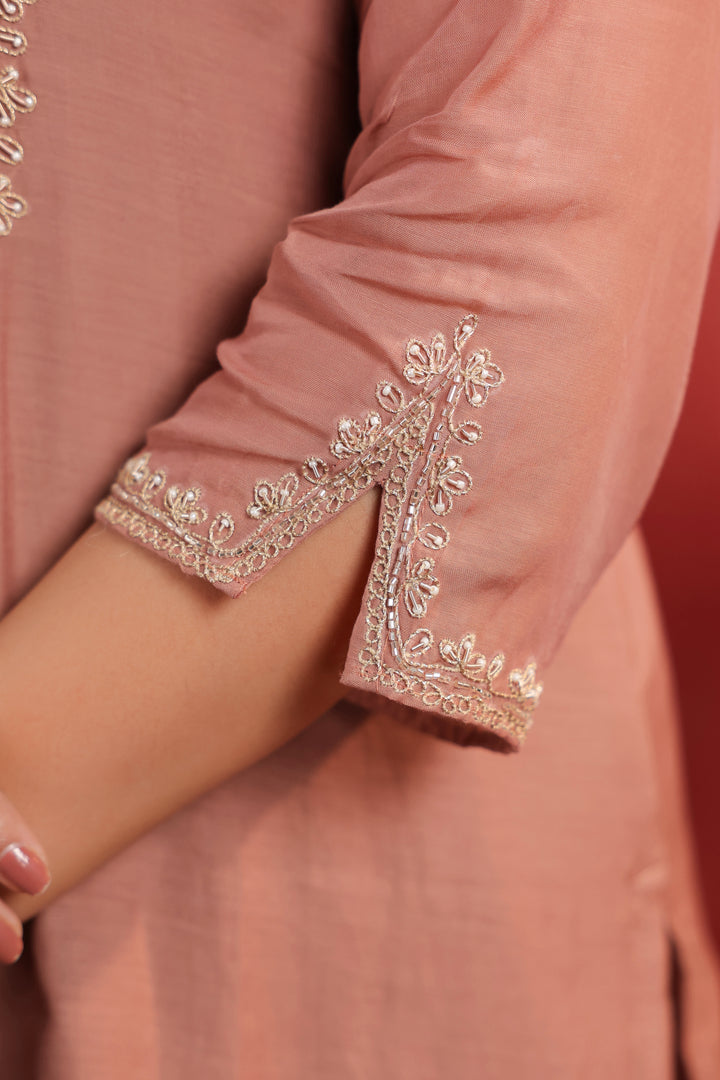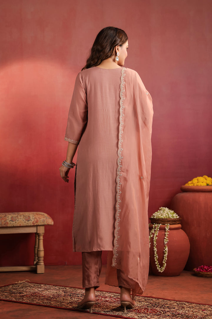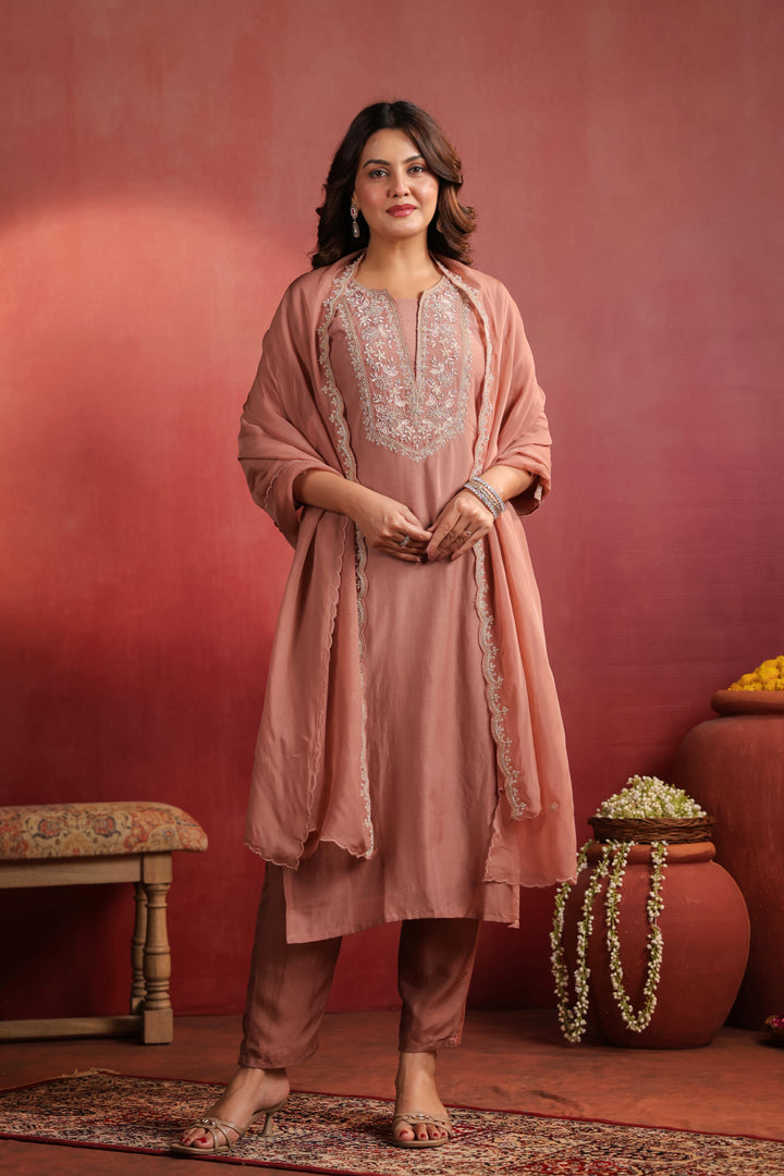 This Mul BROWN Kurti Pant Set showcases exquisite craftsmanship with intricate hand embroidery featuring thread, pearl, zardozi, marodi, and cutdana work. Made from pure Mul Chanderi fabric, it offers a lightweight and breathable feel, perfect for elegant occasions. The harmonious blend of detailed embellishments elevates the traditional design, ensuring a sophisticated and timeless ensemble that combines comfort with artistic finesse.
