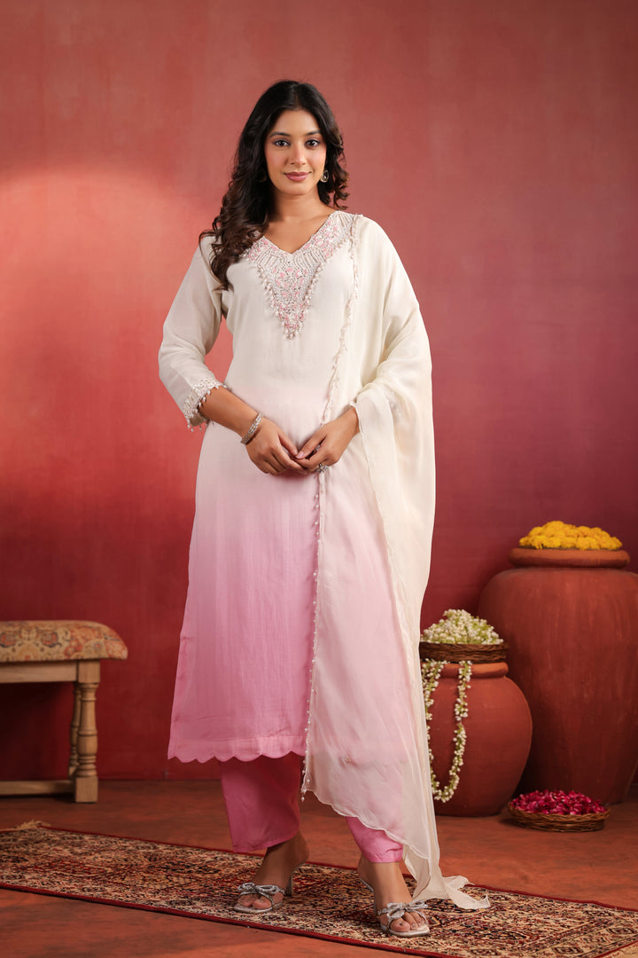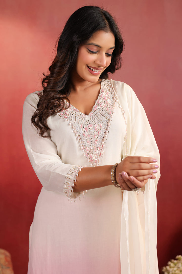 Crafted from pure Mul Chanderi fabric, the Noor White Pink Shaded Kurti Pant Set showcases exquisite handwork featuring delicate pearl, zardozi, resham, and moti embroidery. This elegant ensemble blends traditional artistry with refined fabric, offering a luxurious feel and graceful silhouette ideal for special occasions.