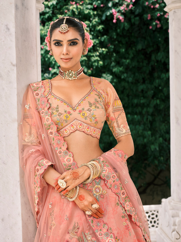 PEACH MULTICOLOUR HANDWORK PREMIUM FANCY SILK LEHENGA SET