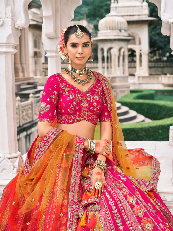 Lehenga Fabric: Fancy Silk (Customise upto 42"), Lehenga Colour: Pink Multi Color, Lehenga Type: Circular, Lehenga Gher: 4 meters, Blouse Fabric: Silk, Blouse Colour: Pink, Blouse Piece Length: 1-1.2 meters, Dupatta: Net With Heavy Work, Dupatta Colour: Shaded Pink & Yellow , Dupatta Length : 2.5 meters