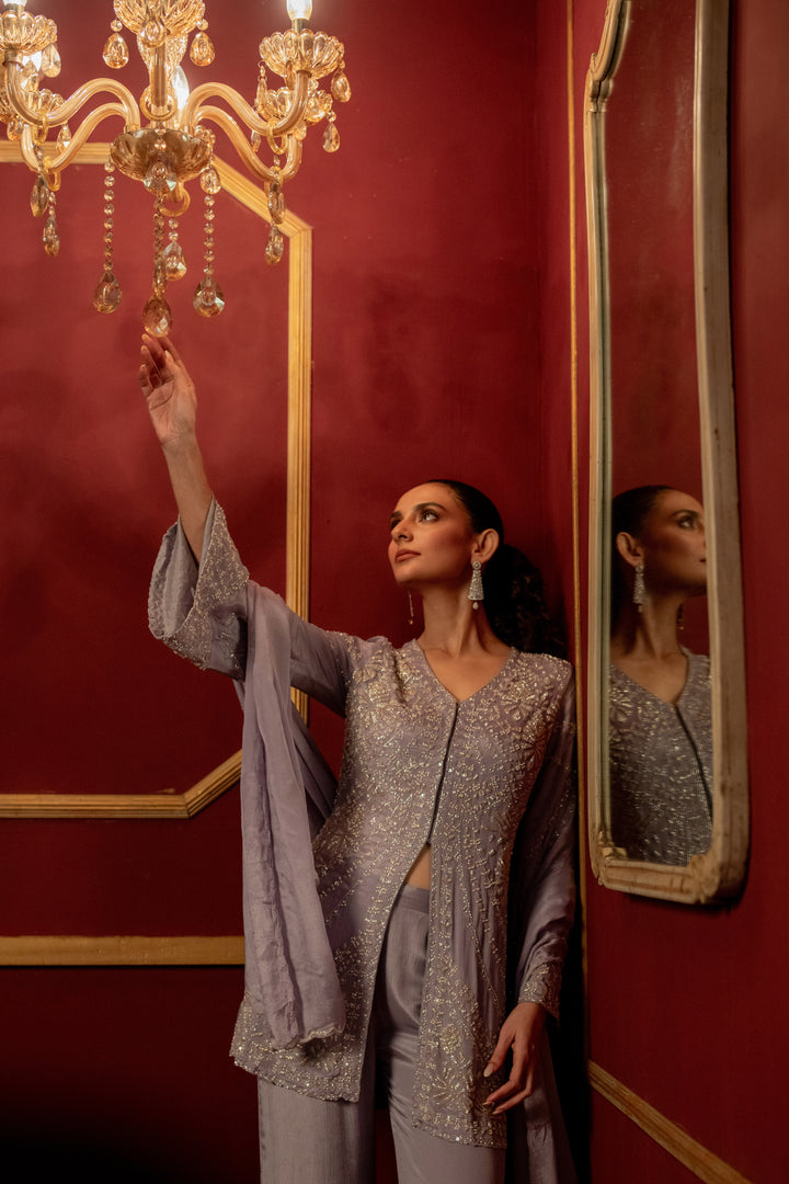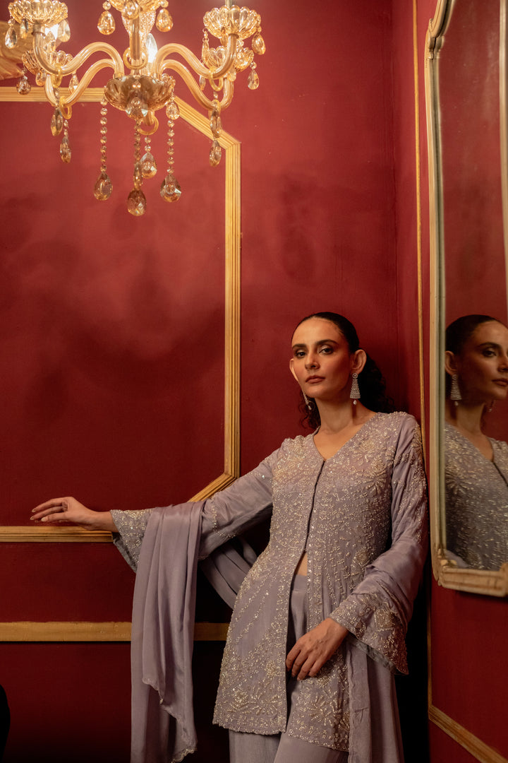 This elegant purple designer dress features a handcrafted combination of a kurti and plazzo crafted from soft chinon fabric, ensuring comfort and graceful movement. The kurti highlights a stylish front slit pattern, enriched with intricate cutdana, pearl, and sequin work that adds a luxurious touch. Accompanied by a matching dupatta, this ensemble blends traditional craftsmanship with contemporary design, making it an ideal choice for sophisticated occasions.