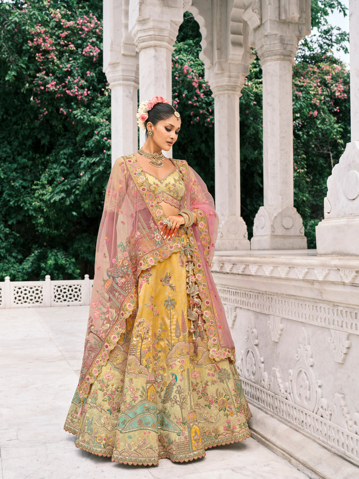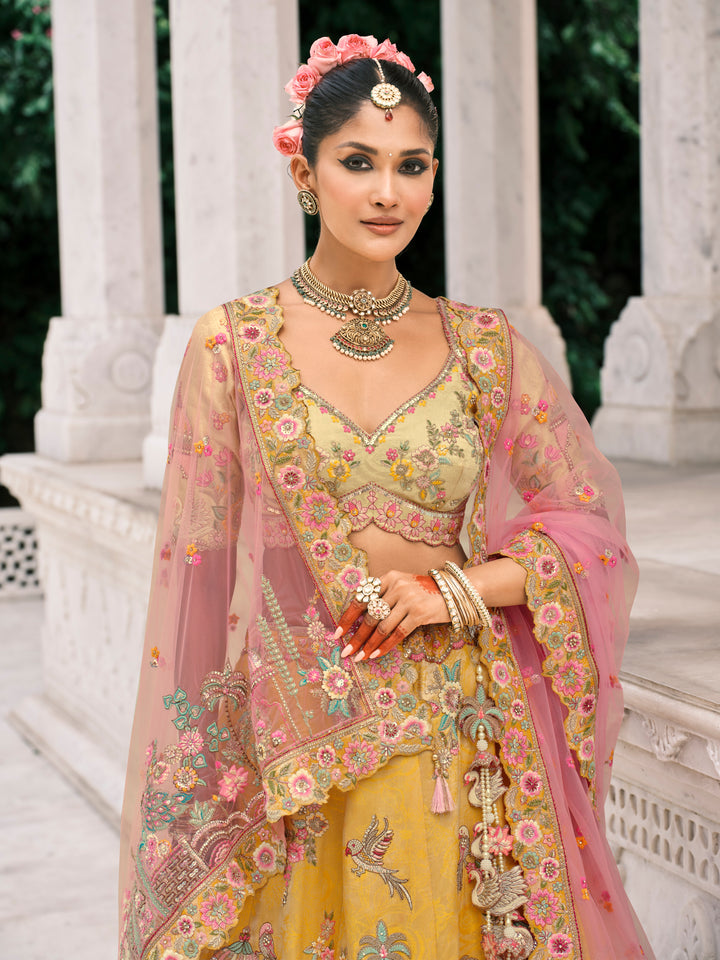 YELLOW CREAM MULTICOLOUR HANDWORK PREMIUM FANCY SILK LEHENGA SET