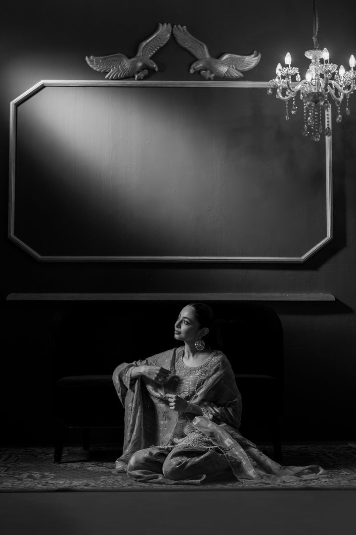 This yellow handcrafted dress set features a kurta paired with palazzo pants and a matching dupatta, all adorned with intricate handwork including resham embroidery, pearls, and cutdana detailing. The elegant craftsmanship highlights traditional techniques, offering a refined and graceful attire suitable for festive occasions or formal gatherings. The lightweight fabric ensures comfort, while the detailed embellishments enhance its sophisticated appeal.